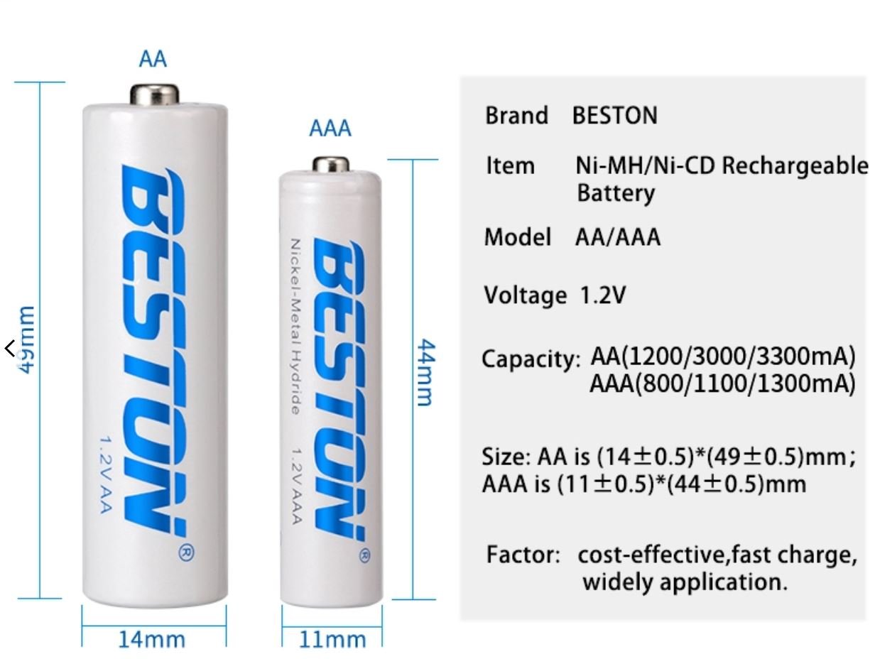 Power your devices efficiently and sustainably with these Beston Rechargeable NiMH AAA Batteries. Featuring a high capacity of 1100mAh, these batteries provide a long-lasting and reliable power source for all your household electronics, from remote controls and toys to cameras and flashlights.