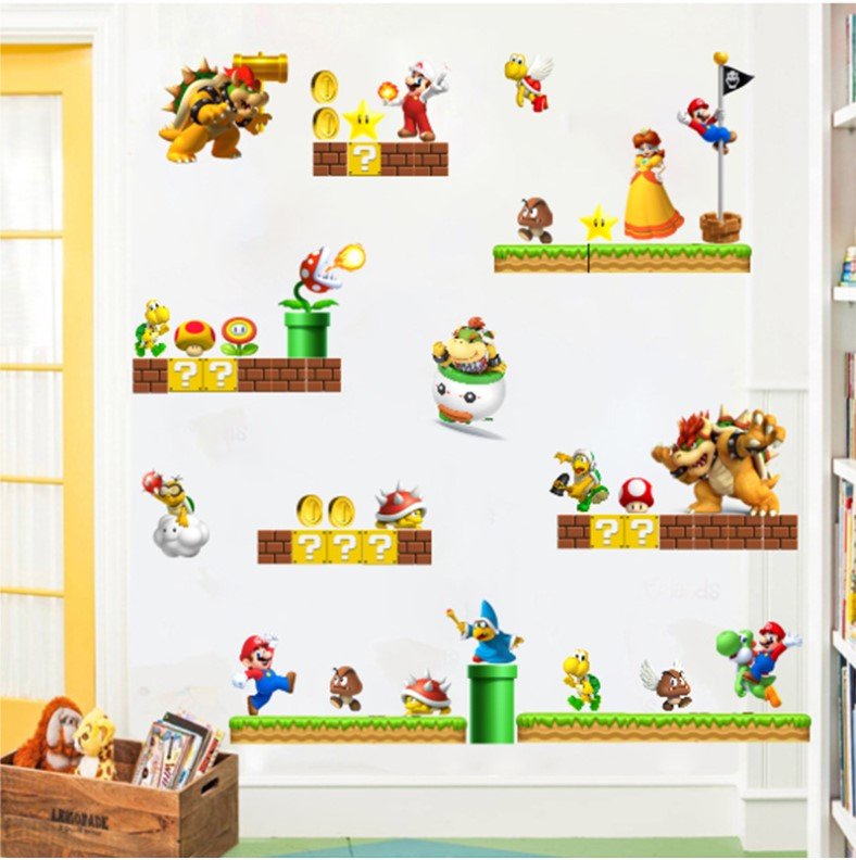 Transform any wall into a Super Mario level with these colorful removable vinyl wall stickers. This set includes Mario, Luigi, Yoshi, Bowser, Koopa Troopas, coins, pipes, and the classic question mark blocks – everything you need to build your own Mario scene at home.