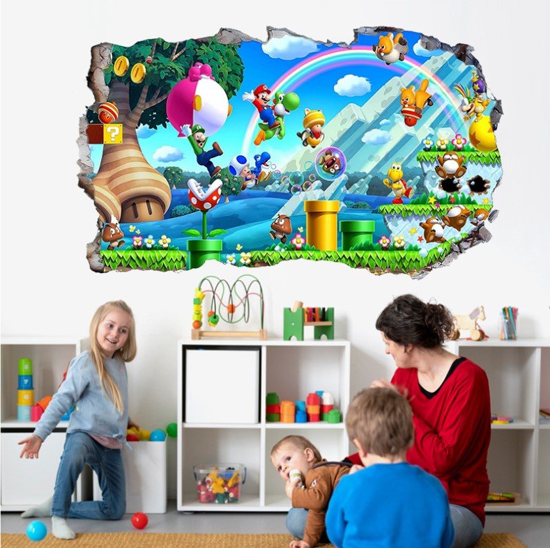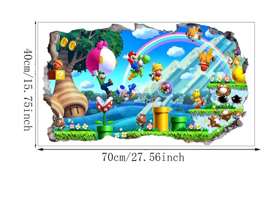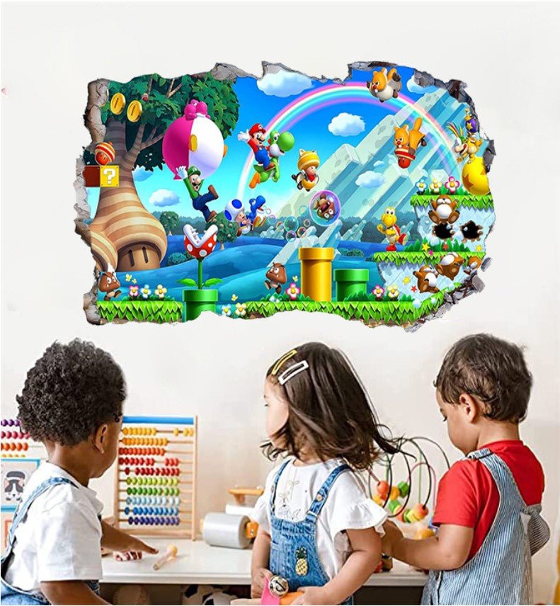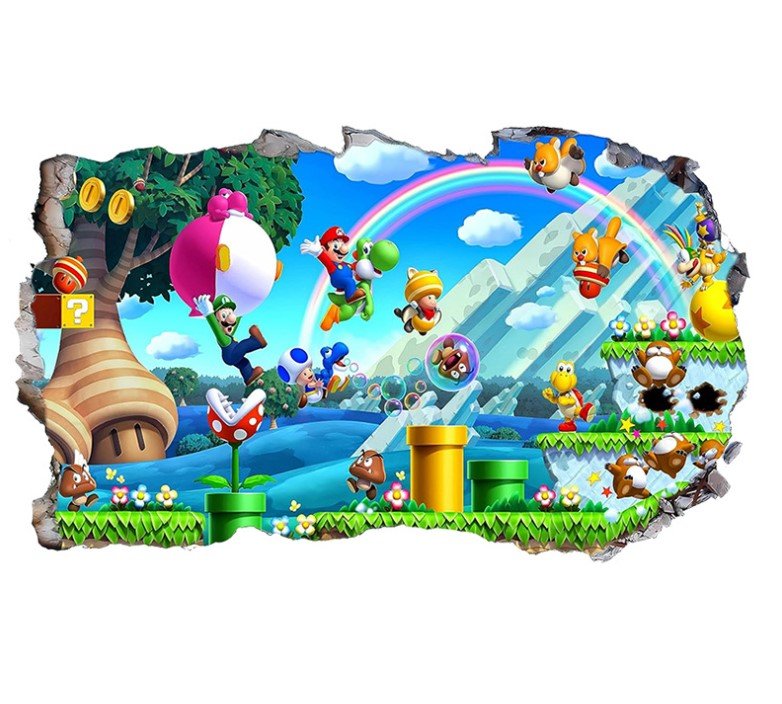 Turn your child’s wall into a vibrant Super Mario adventure with this colorful 3D effect wall sticker mural. Featuring Mario, Luigi, Yoshi, Toad, Koopa Troopas, Goombas, and more, this scene captures the fun of the Mushroom Kingdom with a bright rainbow and playful background.